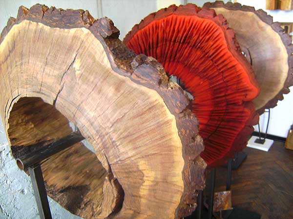 3 Skulpturen in Wallnuss, ca.80x40cm, auf einem Eisengestell